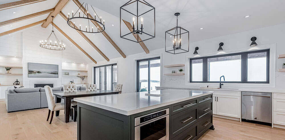 One other key element that was needed was a great main gathering space to entertain and enjoy family moments. With that in mind, the amazing family room was designed! A classy, comfortable space, with high vaulted ceilings, wood beams, shiplap, custom built ins, large windows and sliding doors of the amazing sunset views. Every family moment and large family gather happens in this space. This room was designed as the heart of the home!
