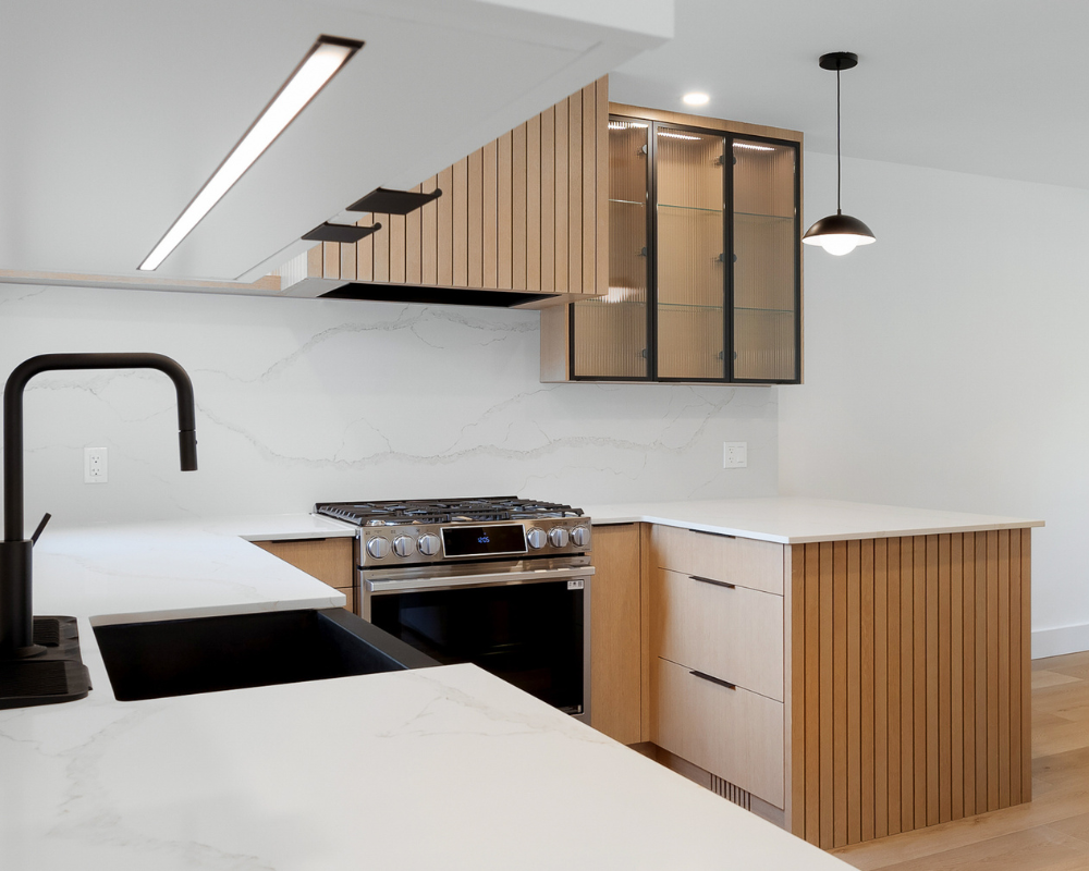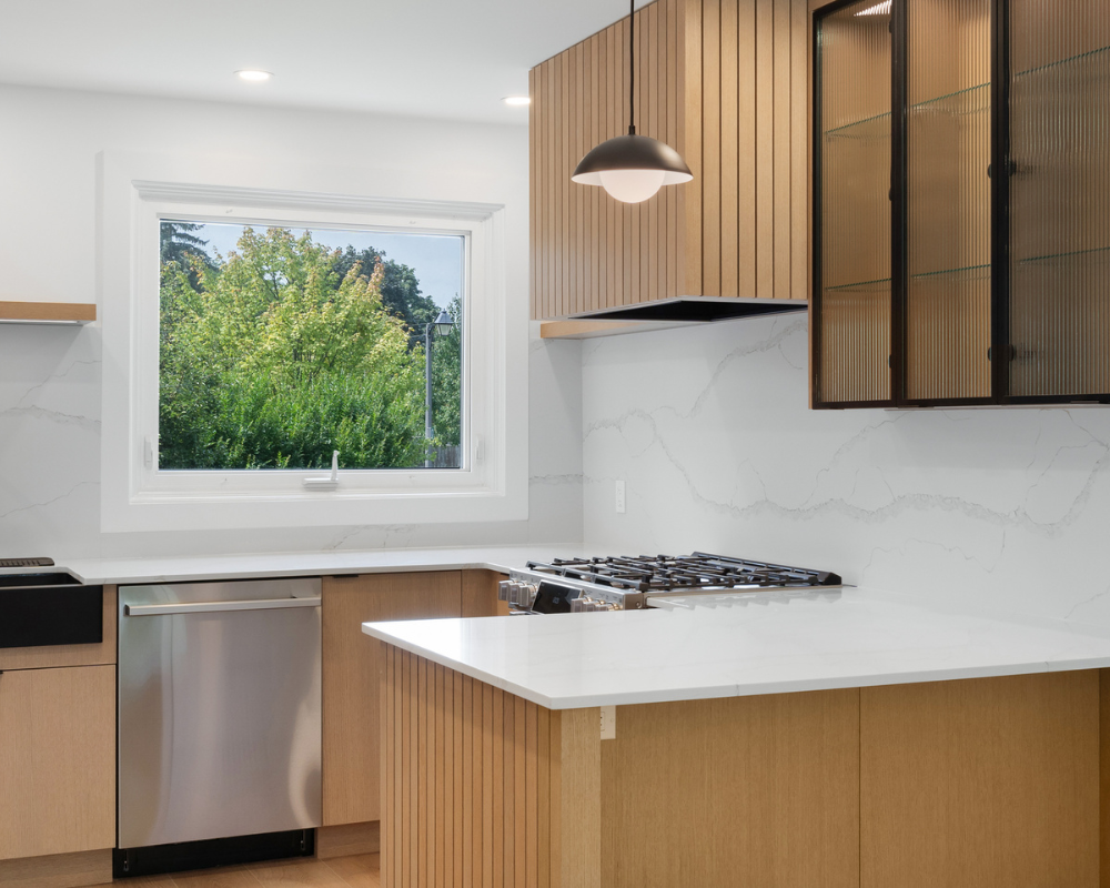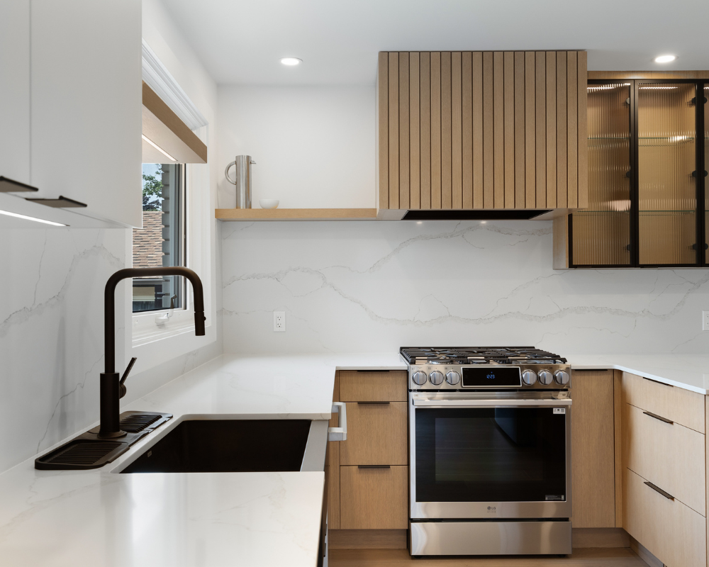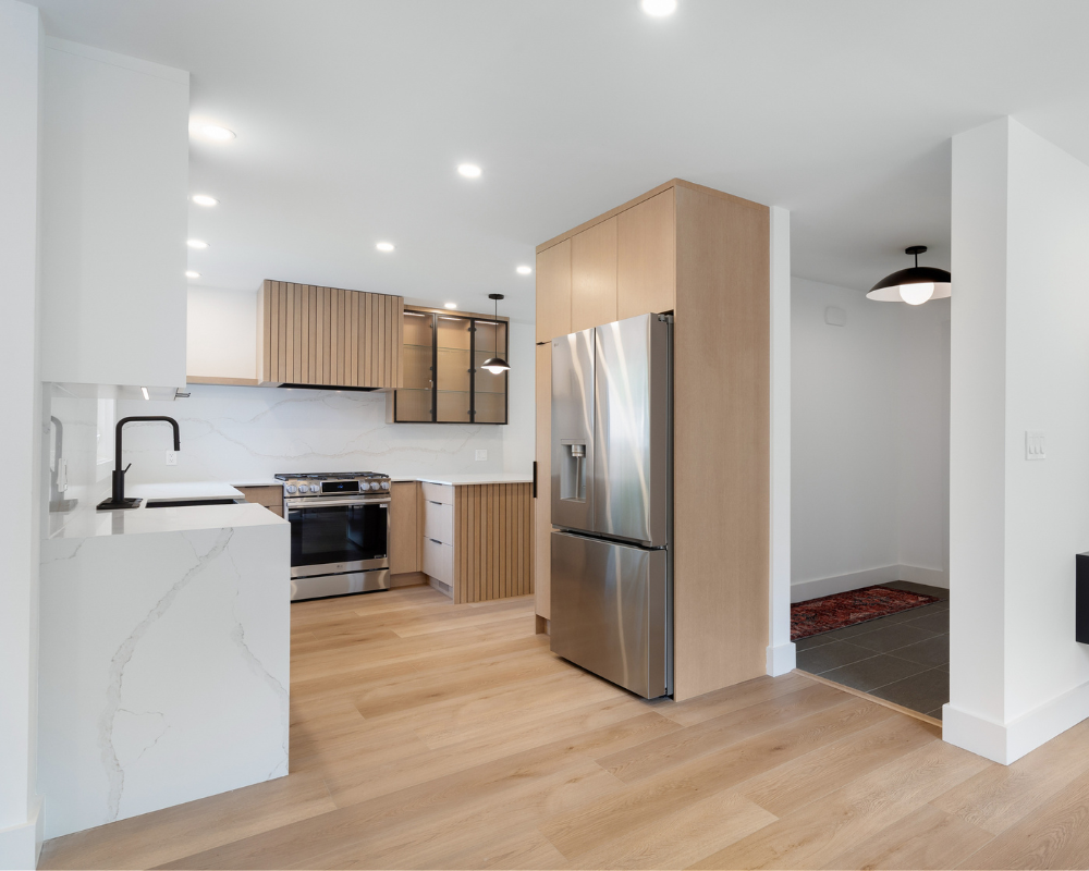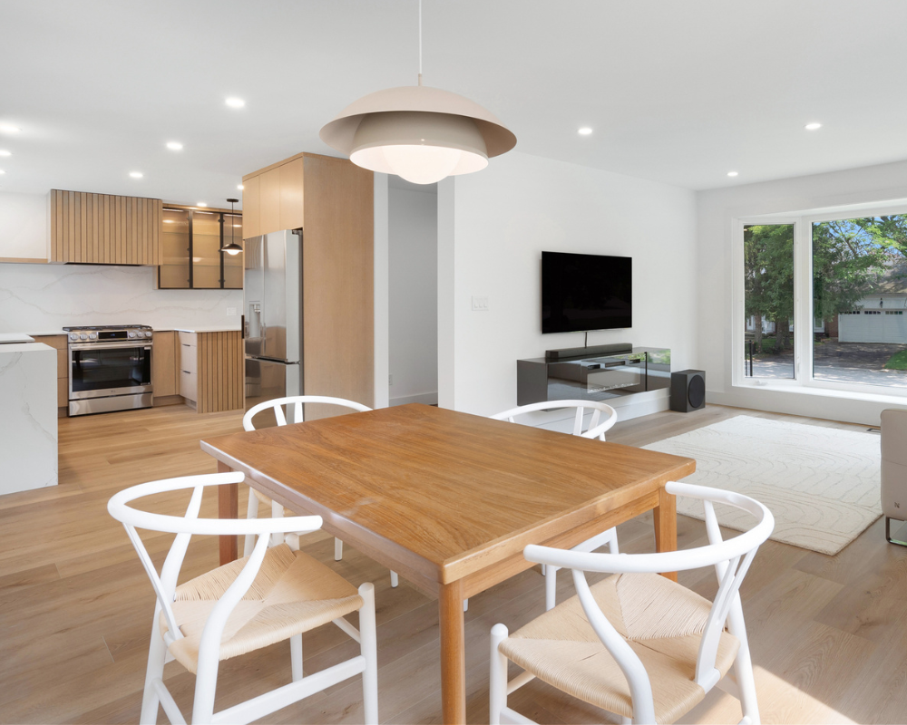 This Dundas, Ontario bungalow renovation reimagined a dated home into a warm, modern retreat defined by clean lines, natural light, and soft light-oak finishes throughout.The main floor was refreshed with a bright, open-concept layout, featuring a sleek contemporary kitchen with custom millwork, quartz surfaces, and minimalist detailing that brings both function and style to everyday living.