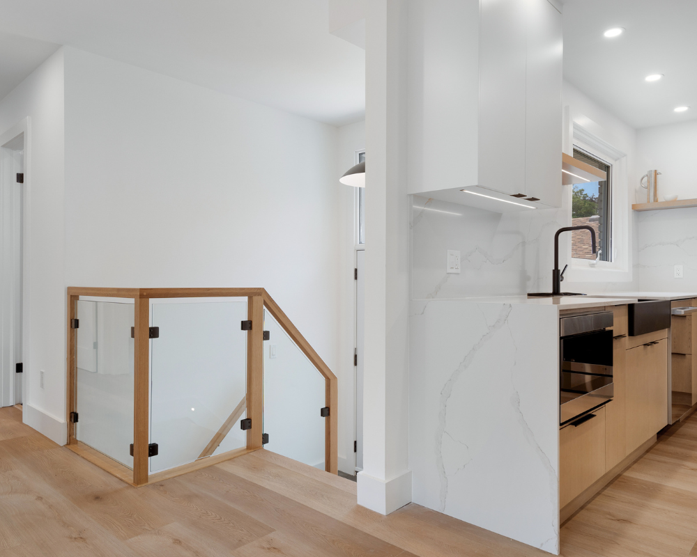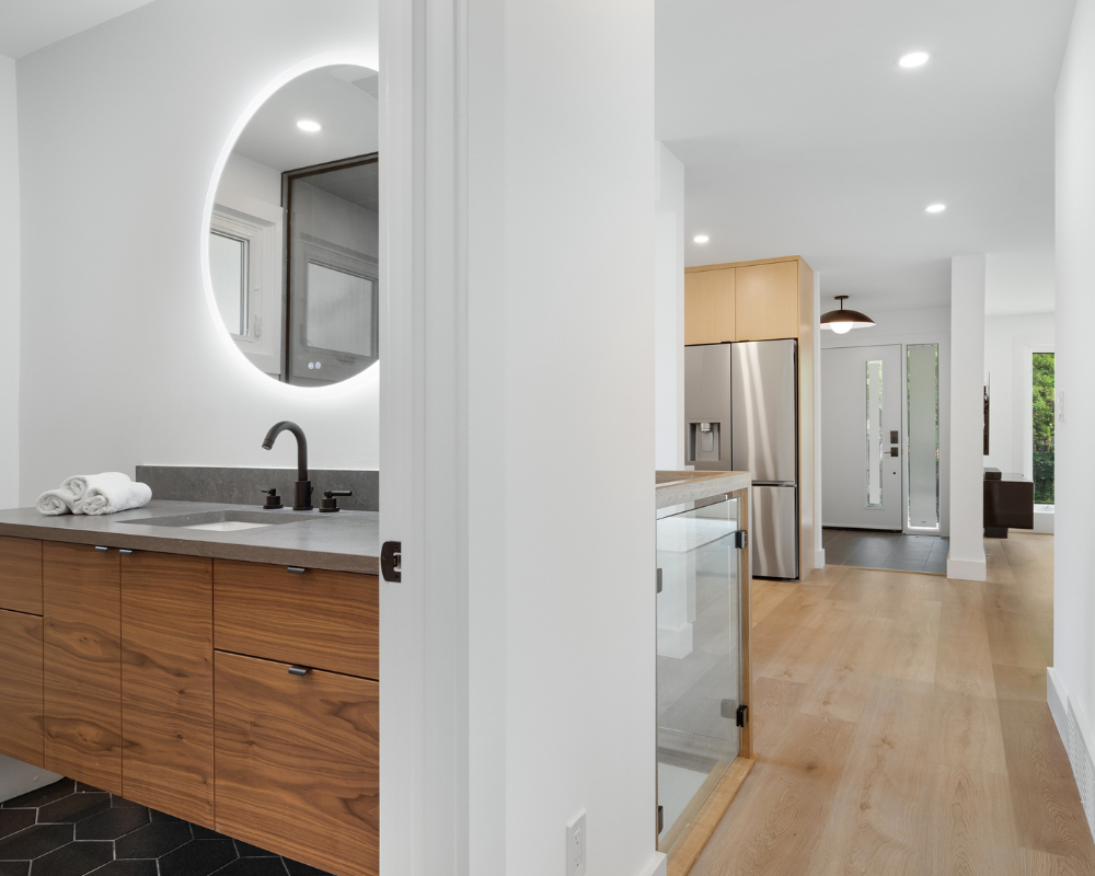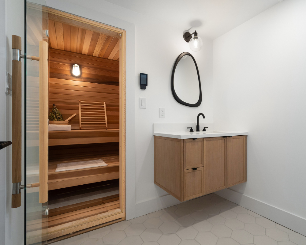 Downstairs, we transformed the basement into a true extension of the home — complete with a spa-inspired bathroom including a private sauna and a fully equipped secondary kitchen, ideal for extended family, entertaining, or multi-generational living. Wide-plank engineered hardwood, integrated lighting, and refined material selections tie every space together for a cohesive, elevated feel.