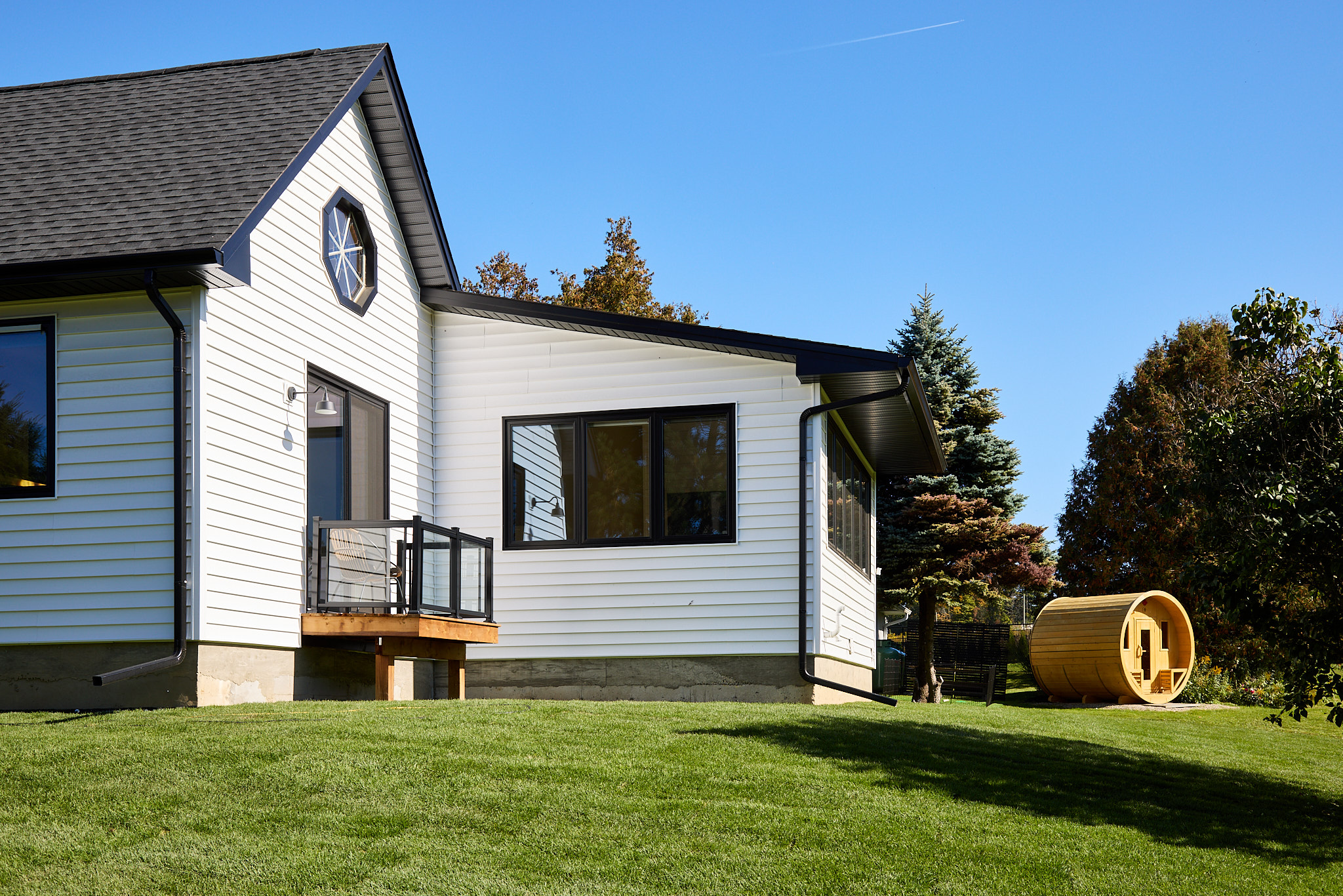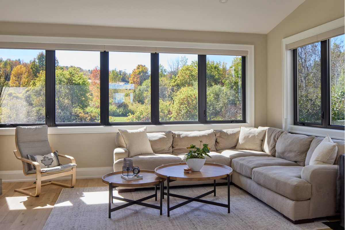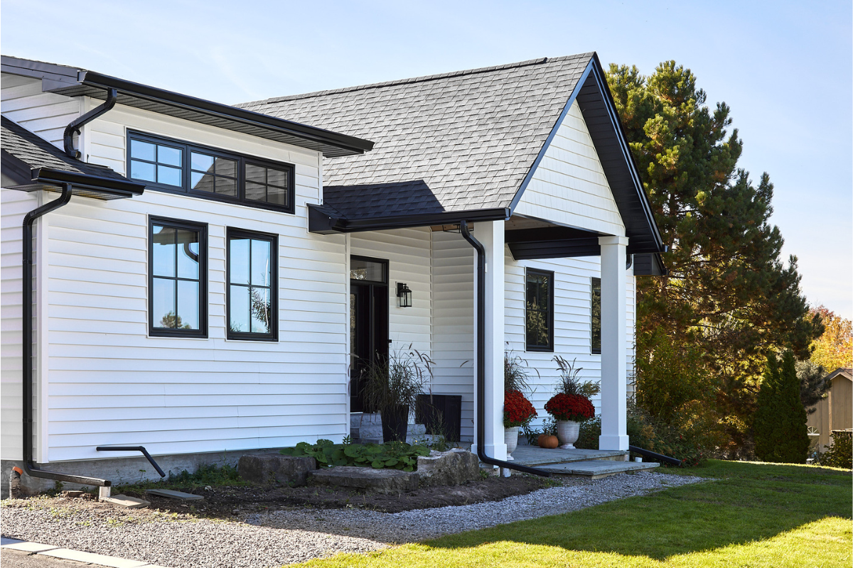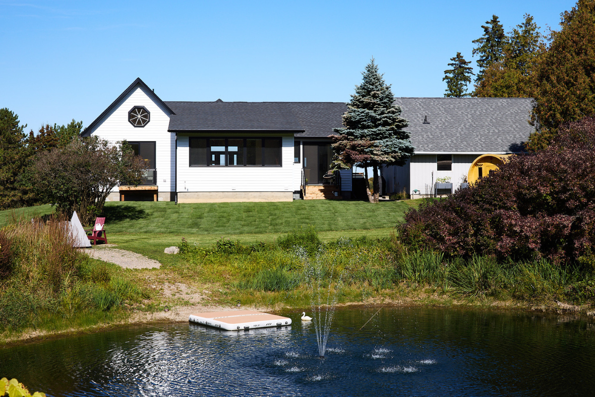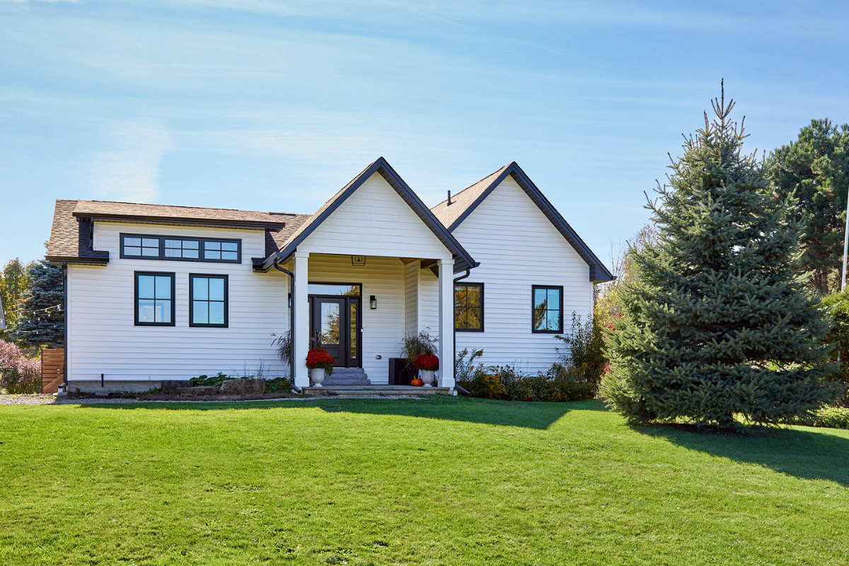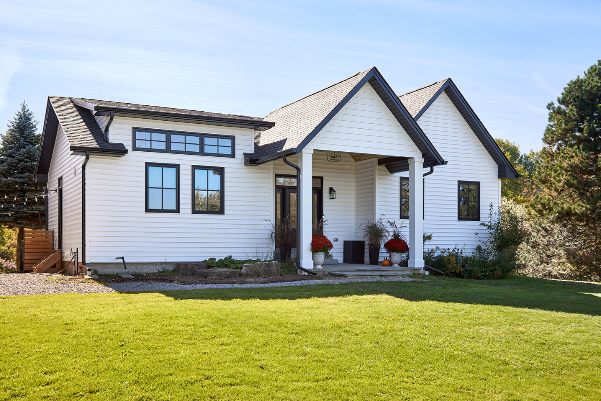 Nestled among rolling hills and mature evergreens, this custom modern farmhouse bungalow in Erin, Ontario is a story of thoughtful transformation and intentional design. What began as a renovation and addition to a century-old log home ultimately became a full custom rebuild, allowing the homeowners to create a space designed for long-term living, comfort, and connection to the surrounding landscape.