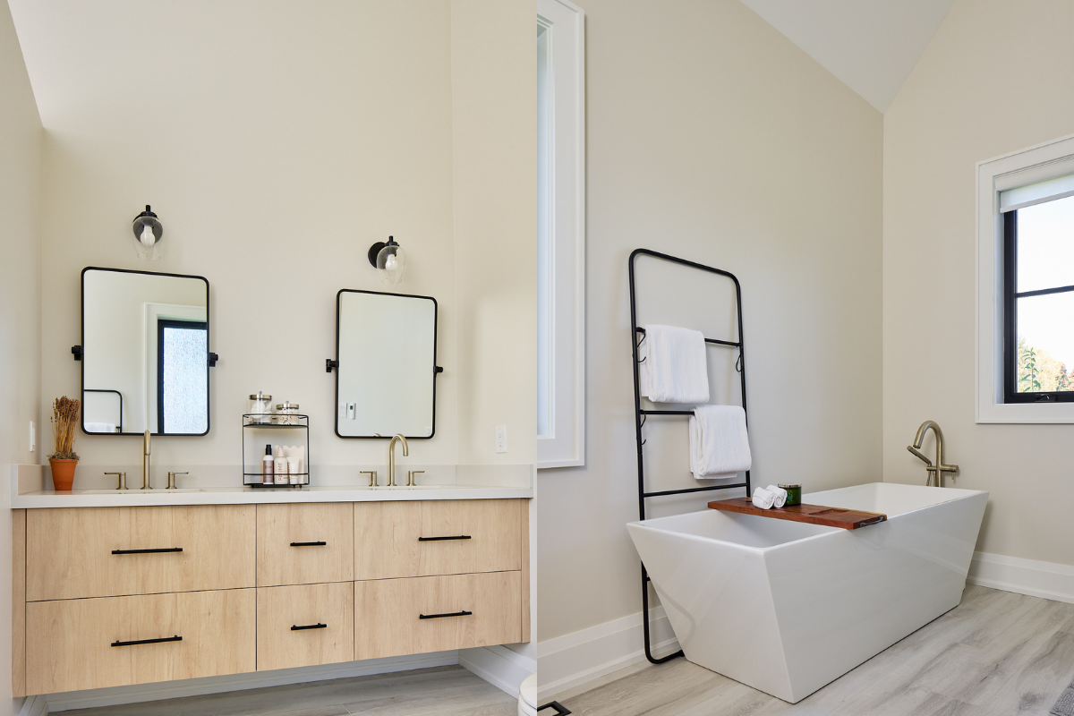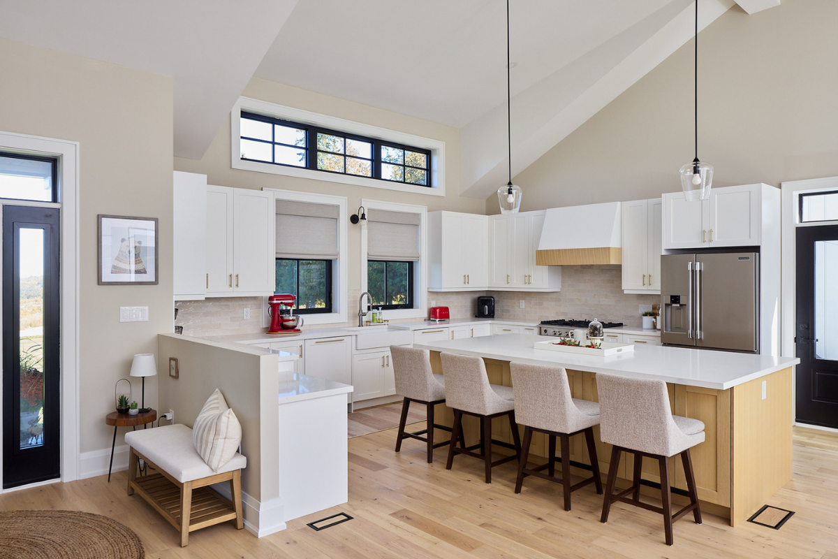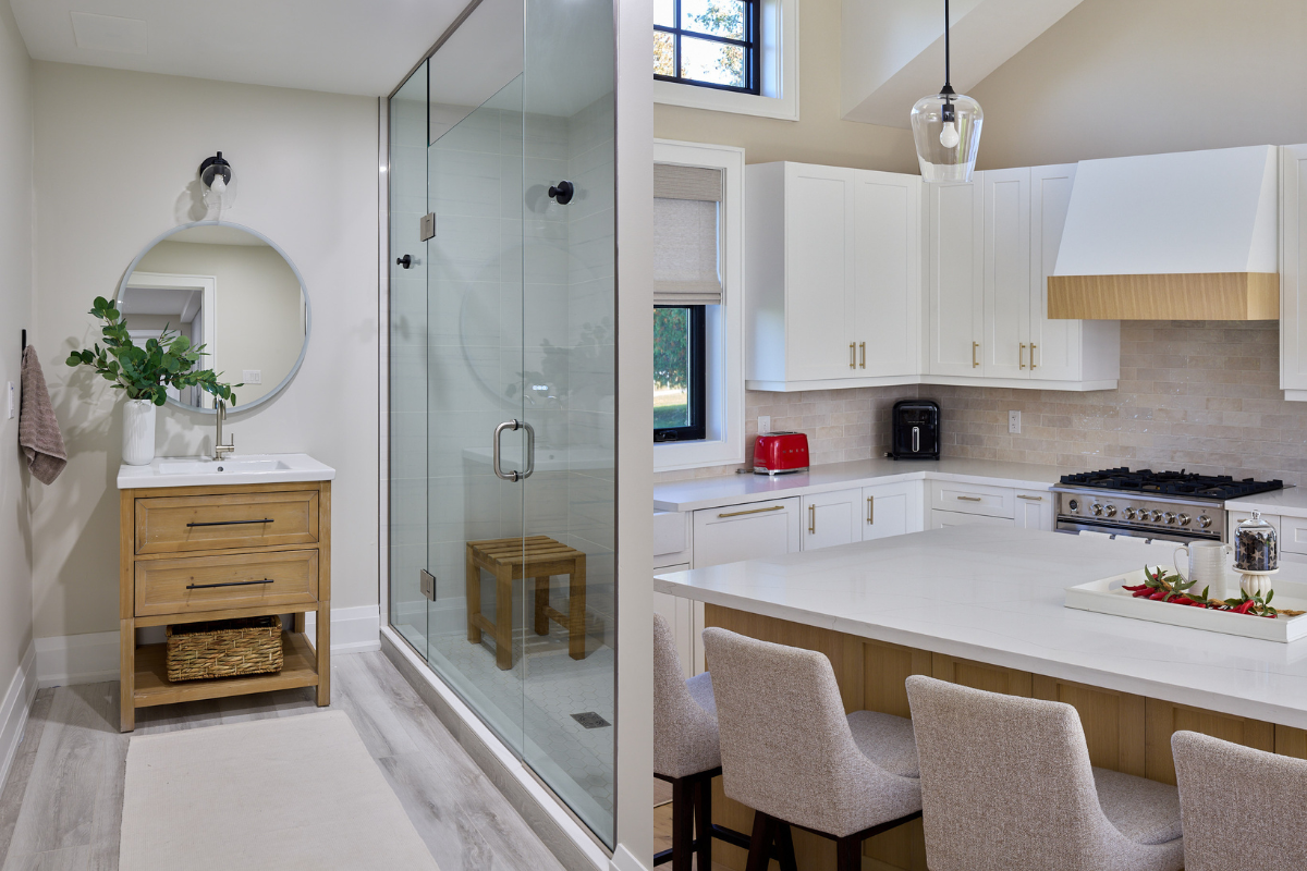 Throughout the home, warm European white oak flooring, white shaker cabinetry, black-framed windows, and natural wood accents strike a refined balance between modern farmhouse and elevated rural living. For homeowners planning their own custom build, we recommend you Download our Custom Home Cost Guide to better understand budgeting, allowances, and long-term value.