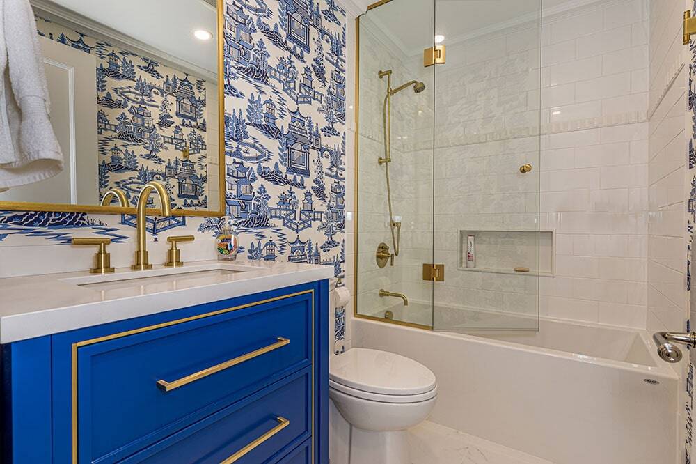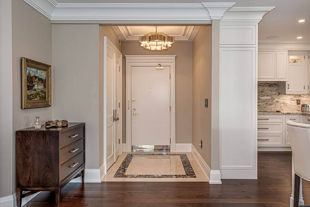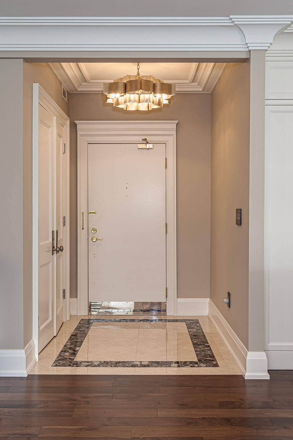 The entry of this home was created using a semi precious tile that was found on the owners travels and imported just for them. It was the anchor color pallet for the entire space and the first eliminate seen when you opened the door. The beautiful tile was important to get perfect as this impact of memories and travel with loved ones deserved to be held and showcased with care. The owners are flooded with these happy memories every time they enter their beautiful space.